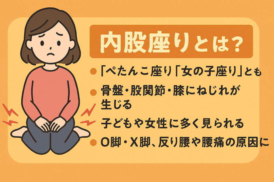 「内股座り」とは、両ひざを内側に曲げて座り、足首を外側に出した姿勢を指します。いわゆる「ぺたんこ座り」や「女の子座り」とも呼ばれ、見た目は安定しているように見えても、骨盤や股関節にねじれの力が加わる姿勢だと言われています。特に、長時間この姿勢を続けると、体のバランスに少しずつ影響を与える可能性があります。