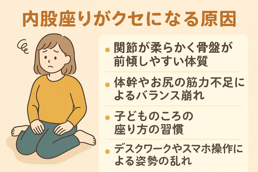 また、幼少期からの座り方の習慣や、正座が苦手な人が自然と内股座りになるケースも見られます。