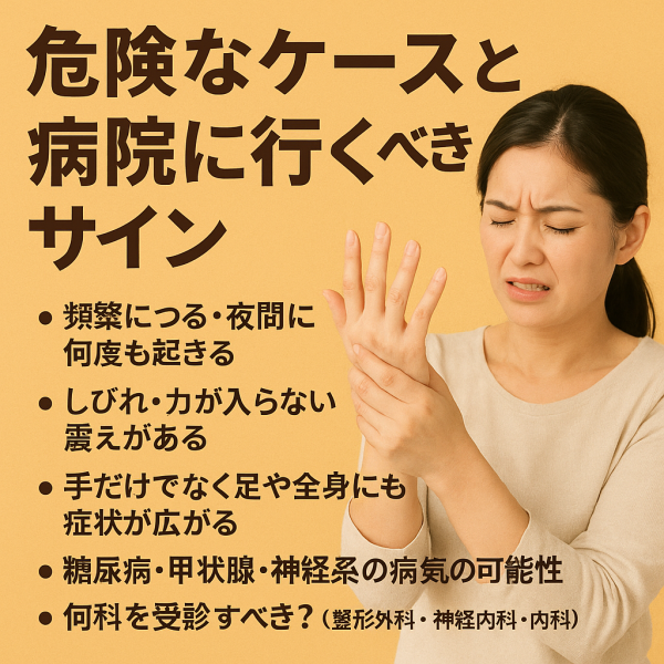 「たまに指がピキッとなる程度」なら、疲労や水分不足による一時的な反応かもしれません。しかし、「毎日のようにつる」「夜間や朝方によく起こる」「しびれや力の入りにくさを伴う」といった場合は注意が必要です。栄養不足や血流障害だけでなく、神経・内臓・ホルモンなどの全身的な不調が隠れていることもあると言われています。