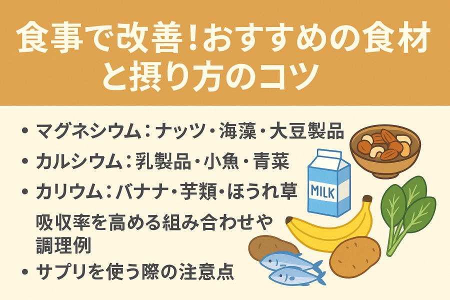 栄養素を食事から摂るのが理想ですが、忙しい日や偏食気味の人はサプリを併用するケースもあります。ただし、マグネシウムやカリウムは過剰摂取で下痢や体調不良を招く場合もあると言われています。摂取量や組み合わせはパッケージの目安を守り、長期間続ける場合は専門家に相談することが安心です(引用元:https://www.krm0730.net/blog/3315/)。