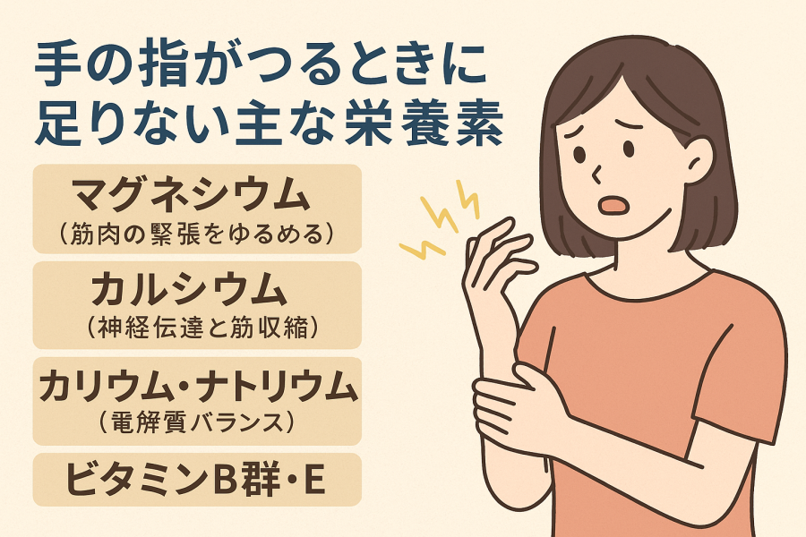 「朝食を抜く」「忙しくて外食中心」「ダイエットで炭水化物を制限している」などの生活パターンでは、マグネシウムやビタミンB群などが不足しやすい傾向があると言われています。また、ストレスや睡眠不足も栄養の吸収を妨げ、体のバランスを崩す要因になります。手の指が頻繁につる人は、食生活だけでなく生活リズム全体を見直すことが大切です。
