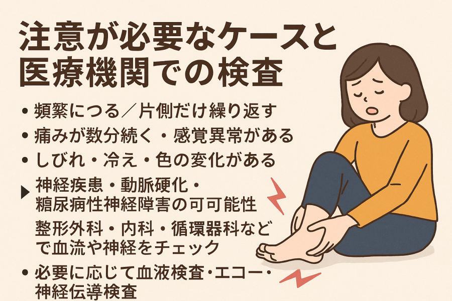 実は、頻繁につったり、痛みが長く続いたりする場合は体からの警告サインである可能性があると言われています。特に「最近よくつる」「年々ひどくなっている」と感じるなら、セルフケアだけでなく原因をしっかり確認することが大切です。