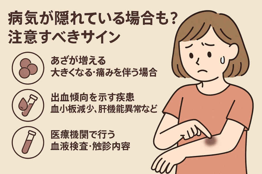 特に頻繁にあざができる場合は、血液や肝機能に関わる可能性も考えられるため、放置せず専門家の意見を聞くことが勧められています。