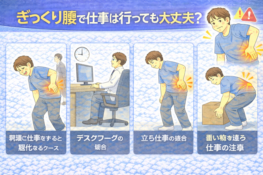 ぎっくり腰のときに無理をして仕事を続けると、腰への負担が増える可能性があると言われています。