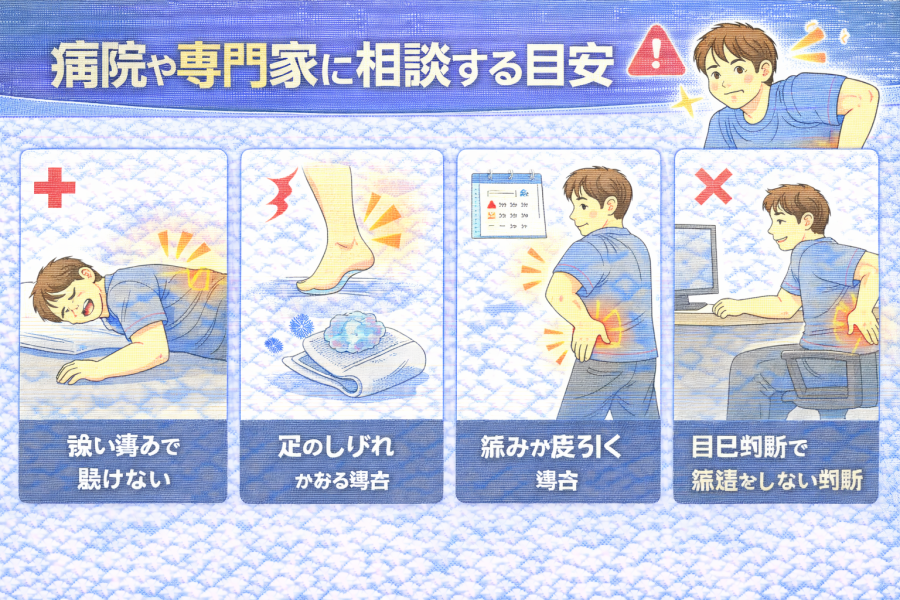 しかし、痛みがある状態で無理に仕事や運動を続けると、腰に負担がかかる可能性があるとも言われています。そのため、痛みが強い場合や不安な症状がある場合は、専門家へ相談することがすすめられるケースもあると紹介されています。