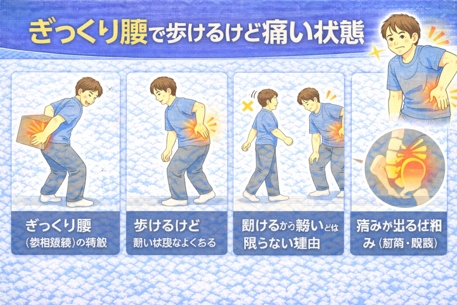 例えば、ゆっくりなら歩けるけれど、腰を伸ばしたり体をひねったりすると痛みが出るケースなどが紹介されています。このような状態は珍しくないと説明されることがあります。