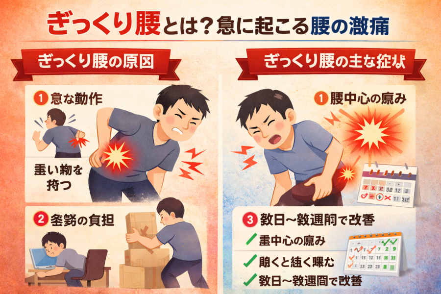 ぎっくり腰は、いわゆる急性の腰のトラブルで、ある日突然強い痛みが出るのが特徴です。正式には「急性腰痛」と呼ばれることもあり、筋肉や関節に急な負担がかかることで炎症が起こると考えられています。