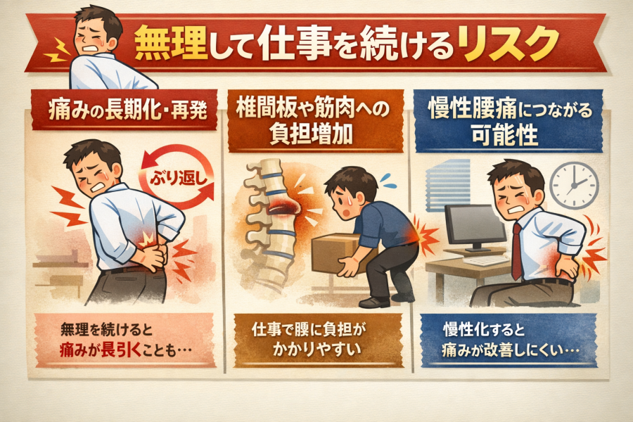 「少し我慢すれば、そのうち落ち着くだろう」と思ってしまう方もいますが、痛みを抱えたまま無理を続けることで、急性の腰痛が慢性的な不調につながることもあると言われています。厚生労働省の腰痛対策研究では、仕事に支障をきたす腰痛が遷延する背景として、身体的な負荷だけでなく、疲労やストレス、働き方の影響も関わることが示されています。くまのみ整骨院でも、腰痛の症状が改善しないまま放置すると、痛みが強くなったり範囲が広がったりする可能性があると案内されています。ぎっくり腰 仕事休むかどうかを考えるときは、「今日だけ乗り切れるか」ではなく、「この先長引かせないか」という視点も大切と言われています。