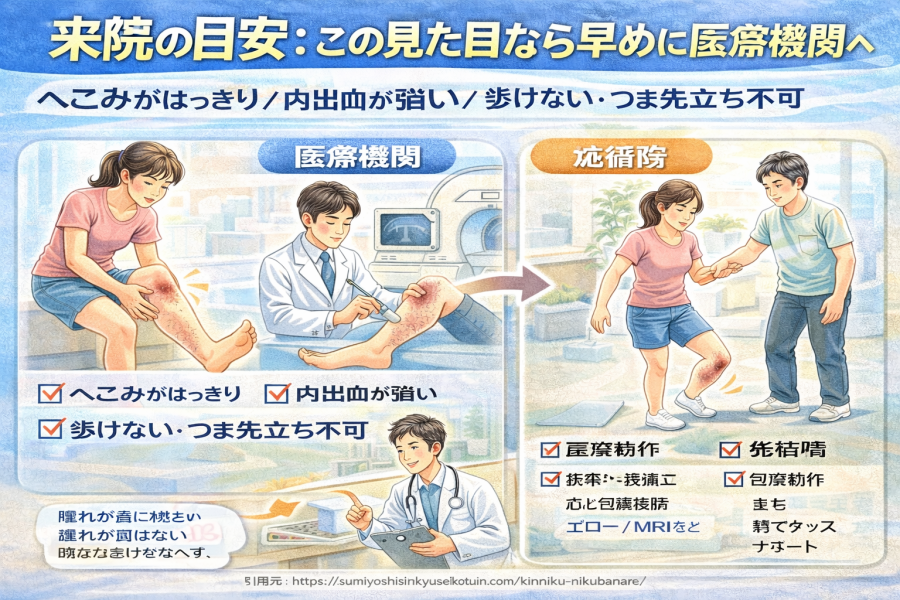 「へこみ(陥凹)がはっきり分かる時は、部分断裂〜重度の可能性もあると言われています。見た目の変化が強いほど“重症度分類”の話につながることがあるので、歩けない、つま先立ちができない、内出血が広がるなどがそろうなら、早めに医療機関へ来院して触診や必要な検査で確認する流れが一般的と言われています。」
