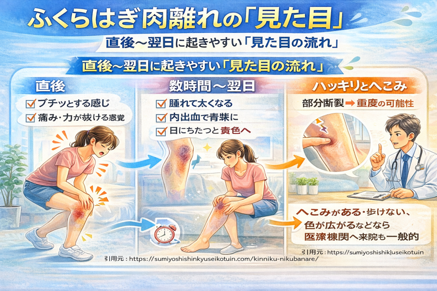 「まず直後は“見た目”よりも、痛みや力が抜ける感じが先に出る人が多いと言われています。走った瞬間に『ブチッ』とした感覚があったり、踏み込めなくなったり、ここは個人差があるようです。外からはまだ分かりにくくても、触るとピンポイントで痛い、つま先立ちがしづらい…みたいなサインが出ることもあると言われています。」