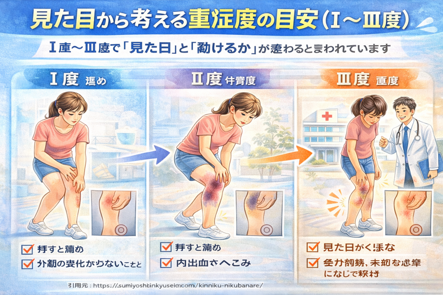「Ⅰ度は、押した時の痛み(圧痛)が中心で、外観の変化が少ない場合もあると言われています。腫れや内出血が目立たないからといって油断すると、動かした時に痛みが増えることもあるようです。まずは無理を減らして、様子を見ながら判断するのが大切と言われています。」