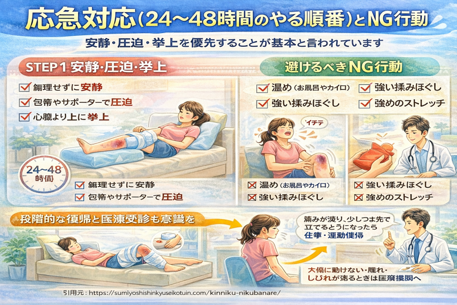 「気持ちはわかります。ただ、受傷直後は温めたり、強く揉んだり、いきなり強めのストレッチをするのは避けたほうがよいと言われています。理由としては、出血や炎症がある段階で刺激が強いと、腫れや痛みが増えることがあるようです。『ほぐしたい』より『まず守る』が先、と覚えておくと迷いにくいと言われています。」