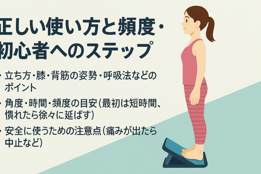 初心者の場合、最初から長時間使うのではなく、1回あたり1〜2分程度から始めるのが推奨されています。慣れてきたら5分程度まで延ばすと、ふくらはぎの柔軟性が向上しやすいと考えられています。頻度としては1日1〜2回が目安で、朝の目覚めや就寝前に取り入れるとリズムが作りやすいと言われています。角度については低めから始め、慣れるにつれて少しずつ傾斜を上げると安全にステップアップできます。このように段階を踏むことで、初心者でも無理なく習慣化できるとされています。