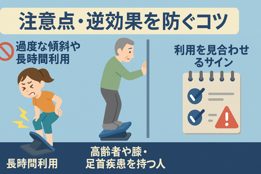 ストレッチボードは誰でも手軽に使える反面、膝や足首に既往症がある人、高齢者にとっては注意が必要です。関節に負担をかけすぎると、かえって炎症を悪化させるケースもあるとされています。そのため、使用前に専門家に相談したり、壁や手すりに手を添えてバランスを保ちながら行うと安全性が高まります。