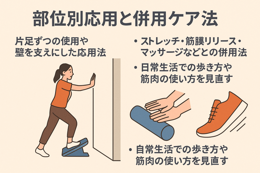 ストレッチボードだけに頼らず、他のセルフケアを組み合わせるとさらに効果が高まると考えられています。たとえば、フォームローラーでの筋膜リリースや、テニスボールを使った足裏のマッサージを併用することで、ふくらはぎの深部まで緊張をほぐせると言われています。運動後や入浴後に実践すると血流も促進され、疲労感の軽減や回復サポートにもつながるとされています。