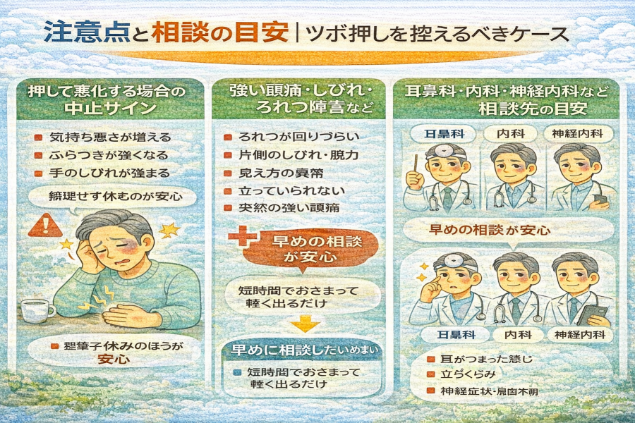 押して悪化する場合の中止サイン「めまいのツボ 手」を押してみて、気持ち悪さが増える/ふらつきが強くなる/手のしびれが強まるみたいな変化が出たら、いったん中止したほうがよいと言われています。