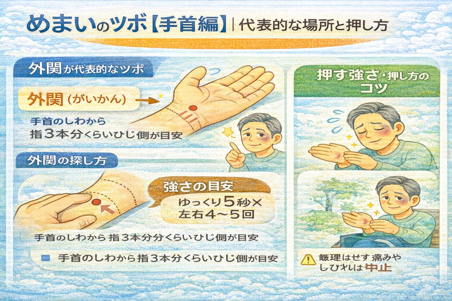 外関(がいかん)など、手首まわりの代表的なツボ「めまいのツボって、手首にもあるの?」と聞かれることがあります。手首まわりでは、**外関(がいかん)**がセルフケアで紹介されることが多いと言われています。外関は手の甲側にあるツボで、乗り物酔いなどの不調に関連して語られることもあるようです。※ツボはあくまでセルフケアの一つで、強いめまいが続く場合は医療機関での確認が大切と言われています。