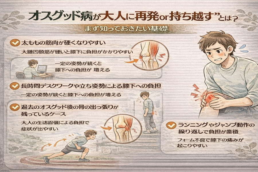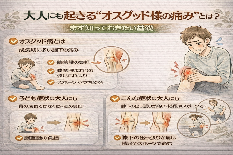 こんな相談をよく頂きます。大人の“オスグッド様の痛み”は、大腿四頭筋の硬さや膝蓋腱への負担が積み重なることで強くなると言われています。
