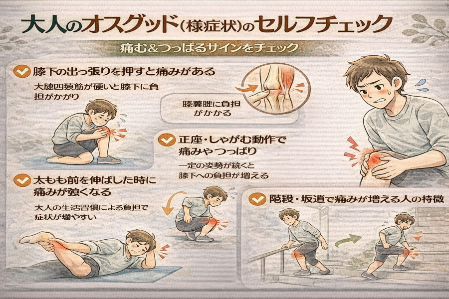 こうしたサインは、大人でもオスグッド様の痛みが起きている可能性があると言われています。特に太もも前が硬い人ほど、膝下への負担が強まりやすい傾向があるようです。
