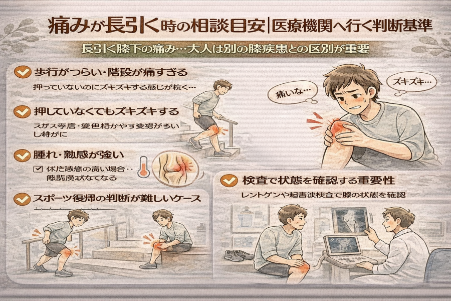 こんな症状は大人にも起きやすい(膝下の出っ張り・押すと痛い・階段やスポーツでズキッとする)