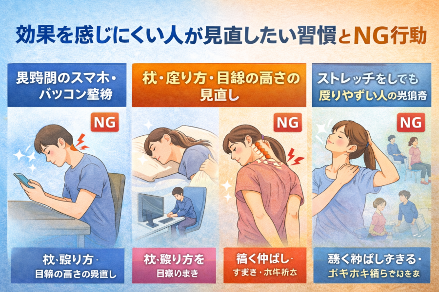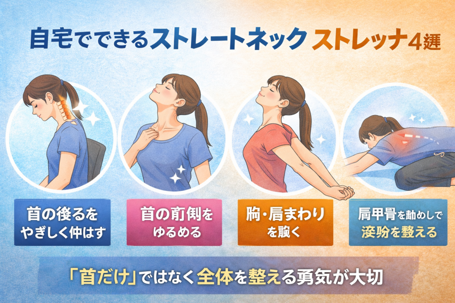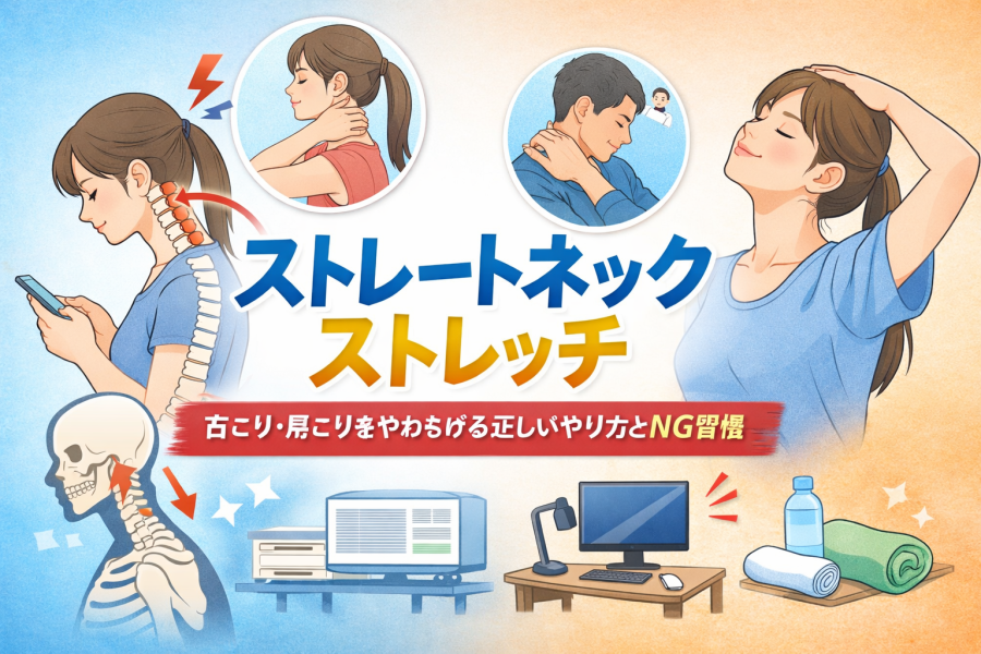 戻りやすい人に共通しやすいのは、首だけを何とかしようとしてしまうことです。参考記事でも、ストレートネックは首だけでなく、体のバランスを整えることも大切とされています。胸まわり、肩甲骨、背中、そして普段の姿勢まで含めて見直していかないと、一時的に楽でも元に戻りやすいと言われています。ストレートネック ストレッチは大切な入口ですが、生活習慣までセットで整えることが改善への近道になりそうです。