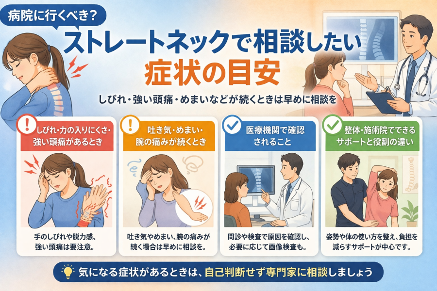 一方で、整体・施術院は、姿勢や体の使い方、首だけでなく胸や肩甲骨まわりまで含めた負担のかかり方を見直すサポートに向いていると言われています。ストレッチだけでなく、日頃の姿勢改善を組み合わせることが大切だとされています。つまり、しびれや脱力感、強い頭痛などの確認はまず医療機関で、日常姿勢や筋肉のこわばり、動かし方の見直しは整体・施術院で、というように役割を分けて考えるとわかりやすいです。どちらが上というより、目的が少し違うと整理しておくと迷いにくくなります。
