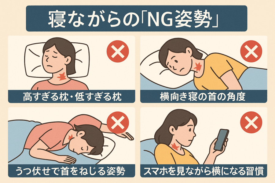 仰向けで枕が高すぎたり、横向きで首が傾いたまま寝ていたりすると、首のカーブが保ちづらくなる例が紹介されています。