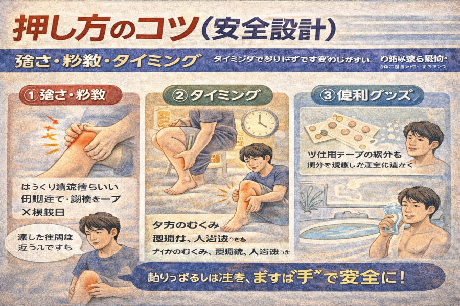タイミング:夕方のむくみ、運動後、入浴後など(「いつ押すか」を入れると読了率が上がりやすい)