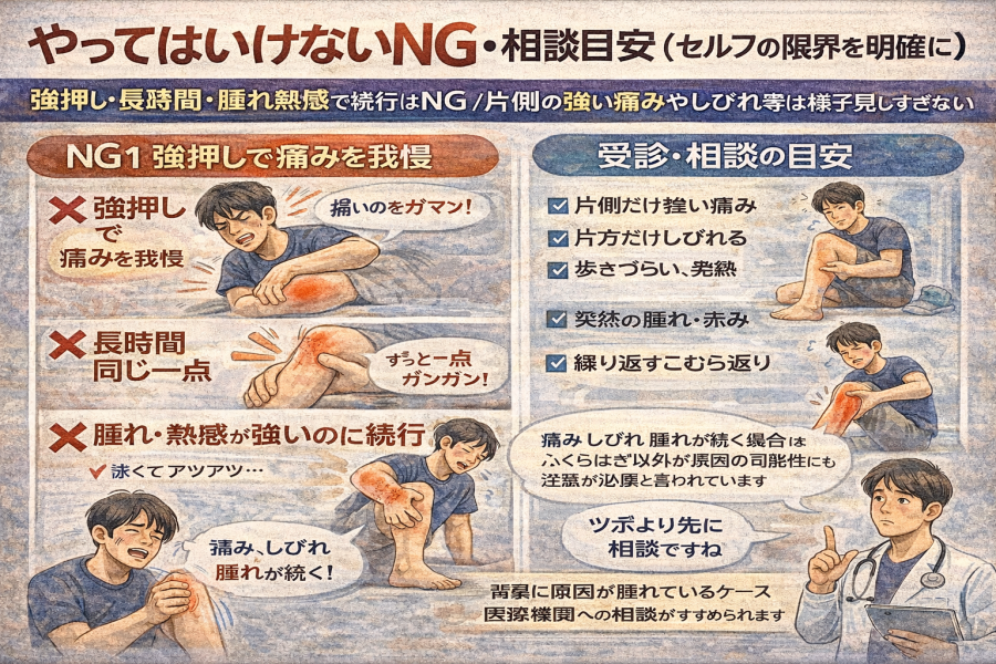 次に、相談の目安です。片側だけ強い痛みが続く、しびれが出る、歩きづらさがある、原因不明の発熱がある、突然の腫れや赤みが出た、こむら返りが何度も繰り返す。こういったサインがある時は、ツボ押しで粘りすぎず、医療機関へ相談する流れがすすめられています。ふくらはぎの不調でも、背景に別の原因が隠れている可能性があると言われているためです。