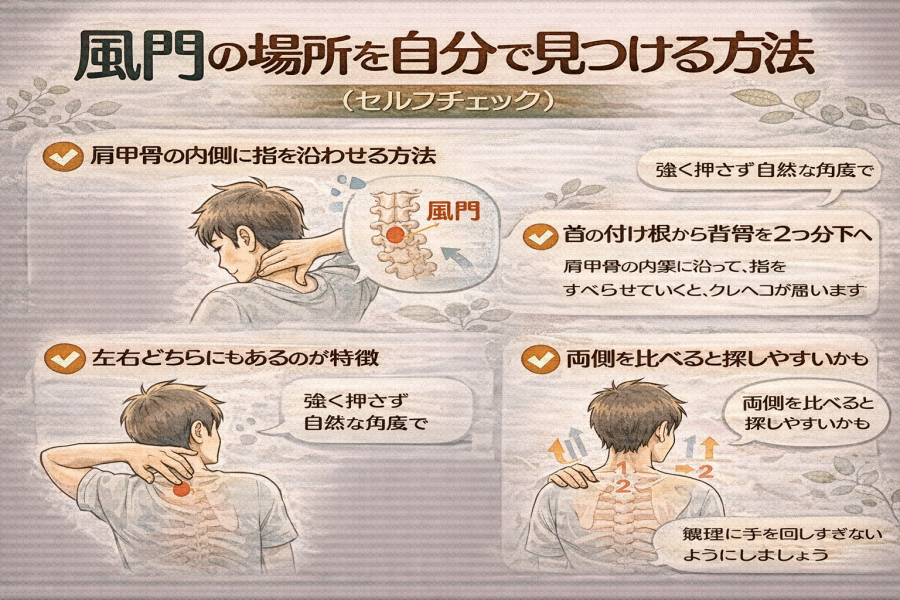 ゴリッと触れる骨の出っ張りを起点にして、そこから“背骨2つ分下”が風門の目安と紹介されることが多いです。「あれ、ちょっと見つけづらい…」と感じても大丈夫。骨の位置は個人差もあるため、ふわっと触れながら探すくらいでちょうど良いとされています。
