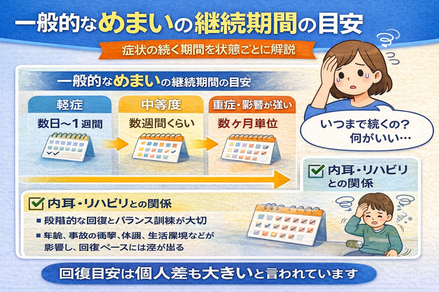 こんな声がよく聞かれます。結論から言うと、めまいの継続期間にはある程度の目安はあるものの、個人差が大きいと言われています。