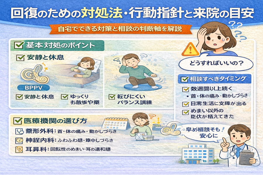 こうした場合、内耳のバランス機能がうまく回復途中にある可能性も考えられています。体は少しずつ慣れていくため、リハビリ的な考え方で段階的に日常動作へ戻していくケースもあると言われています。