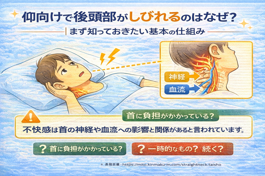 後頭部には、後頭神経と呼ばれる神経や、首まわりの血管が集まっています。仰向けになることで首のカーブが崩れたり、筋肉が緊張したりすると、神経や血流に一時的な影響が出る可能性があると紹介されています。特に、首が前に出やすい姿勢や、ストレートネック傾向がある方では、仰向け時に後頭部の違和感やしびれを感じやすいケースがあるようです。