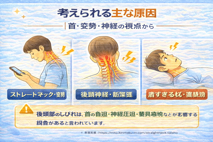 このように、仰向け時のみ後頭部のしびれが出るケースでは、首の角度や枕との相性が影響している可能性があると言われています。体勢を変えることで首や筋肉への圧が変わり、神経や血流の影響が一時的に出ている状態と考えられることもあるようです。