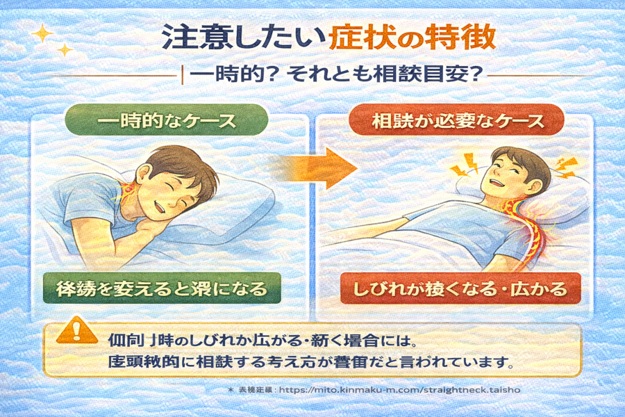 短時間で違和感が落ち着き、日中はほとんど気にならない場合は、姿勢や寝具環境が関係しているケースとして整理されることが多いと紹介されています。