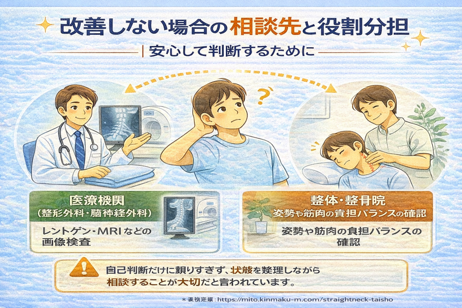 そのようなケースでは、整体や整骨院で姿勢・首肩まわりの筋緊張・体の使い方といった視点から体を確認する選択肢もあると言われています。