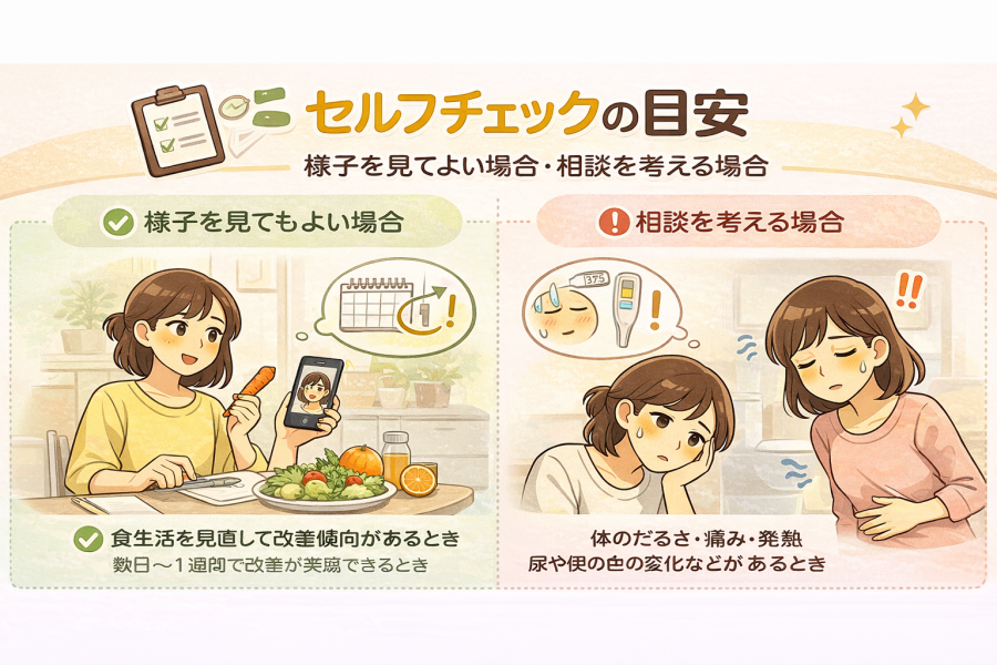 こう迷う方は多いと言われています。ここではあくまで一般的な目安として、「様子を見てもよいとされるケース」と「相談を考えたいケース」を、セルフチェックの形で整理してみますね。食生活を見直して改善傾向があるか