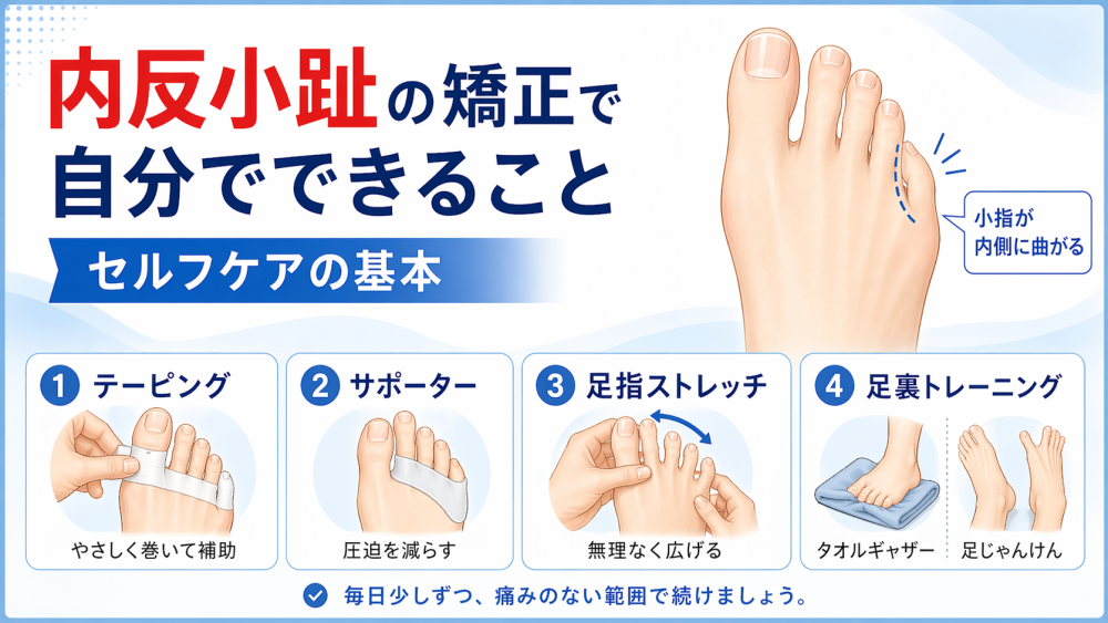 内反小趾 矯正というと特別なことが必要に見えるかもしれませんが、まずは自分でできることから始める方も多いです。大切なのは、「つければ改善する」「一回で変わる」と考えすぎず、日々の負担を減らしながら続けやすい方法を選ぶことだと言われています。