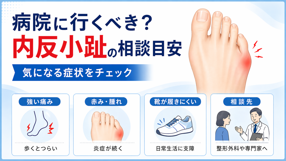 強い痛みが続く、赤みや腫れが引かない、歩くのがつらい、靴が履きにくい。こうした症状があるときは、早めに整形外科などへ相談する目安になると言われています。急に悪化した場合も、無理を続けないほうが安心です。