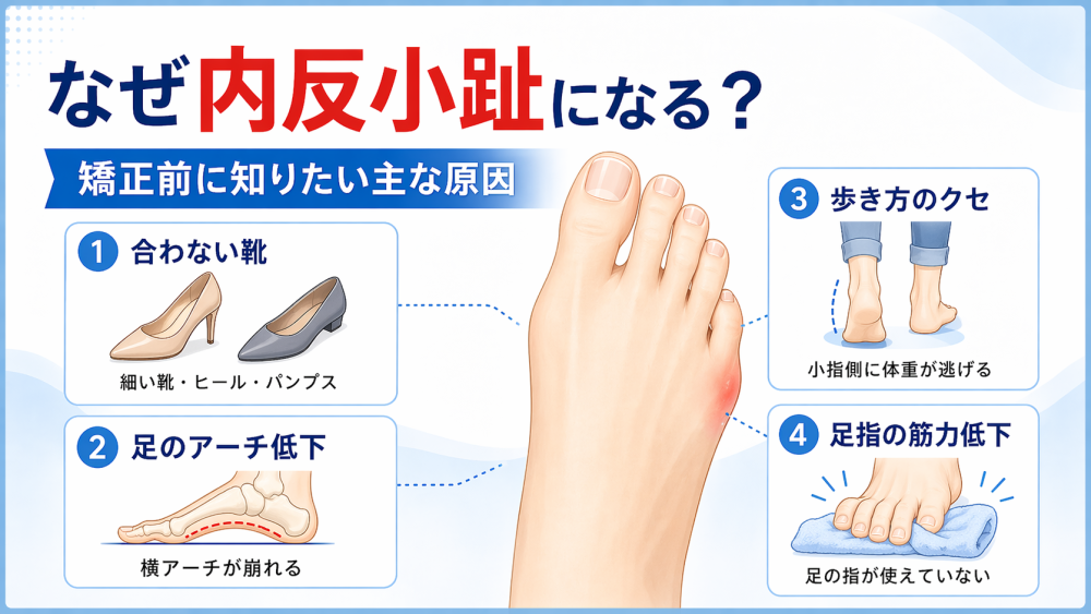 内反小趾 矯正を考えるなら、まず原因を知っておきたいところです。というのも、足の小指だけを見ていても、負担のもとが残ったままだと同じことを繰り返しやすいからです。参考記事でも、靴だけではなく、足のアーチや歩き方、足指の使い方まで関係すると言われています。