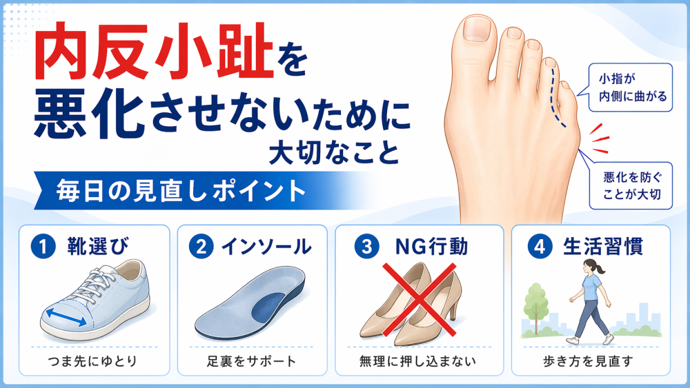 内反小趾 矯正では、今ある痛みへの対応だけでなく、これ以上悪化させない工夫も大切です。セルフケアをしていても、普段の靴や生活習慣がそのままだと、負担が戻りやすいと言われています。だからこそ、毎日の見直しが意外と大きいんです。
