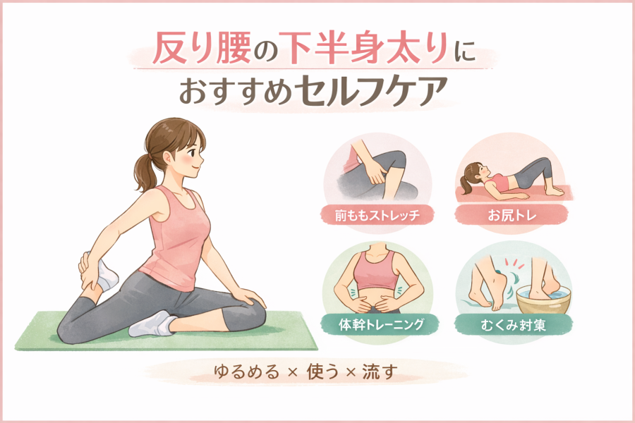 ここ、いちばん気になりますよね。反り腰による下半身太りは、ストレッチだけ・筋トレだけといった“単発の対策”よりも、体のバランスを整える組み合わせが大切と言われています。ポイントは「ゆるめる」と「使えるようにする」をセットで行うこと。さらに、むくみ対策や日常の習慣も含めて整えていくことで、見た目の変化を感じやすくなると考えられています。