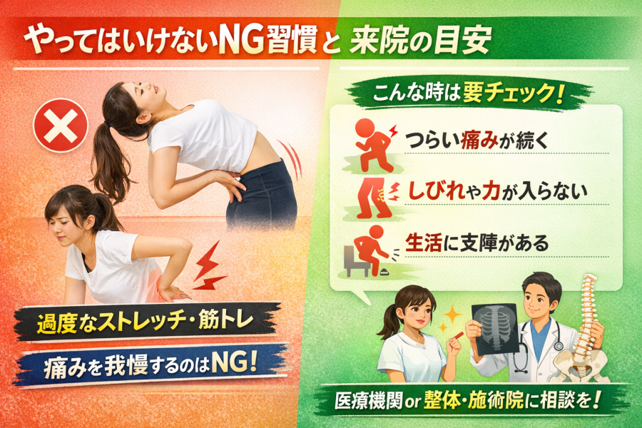 実はその考え、少し注意が必要かもしれません。反り腰や下半身太りに対して、やり方を間違えると逆に負担が増えてしまうケースもあると言われています。また、セルフケアだけで様子を見るべきか、それとも来院を検討した方がいいのか迷う場面もありますよね。ここでは、悪化を防ぐための注意点と判断の目安を整理していきます。