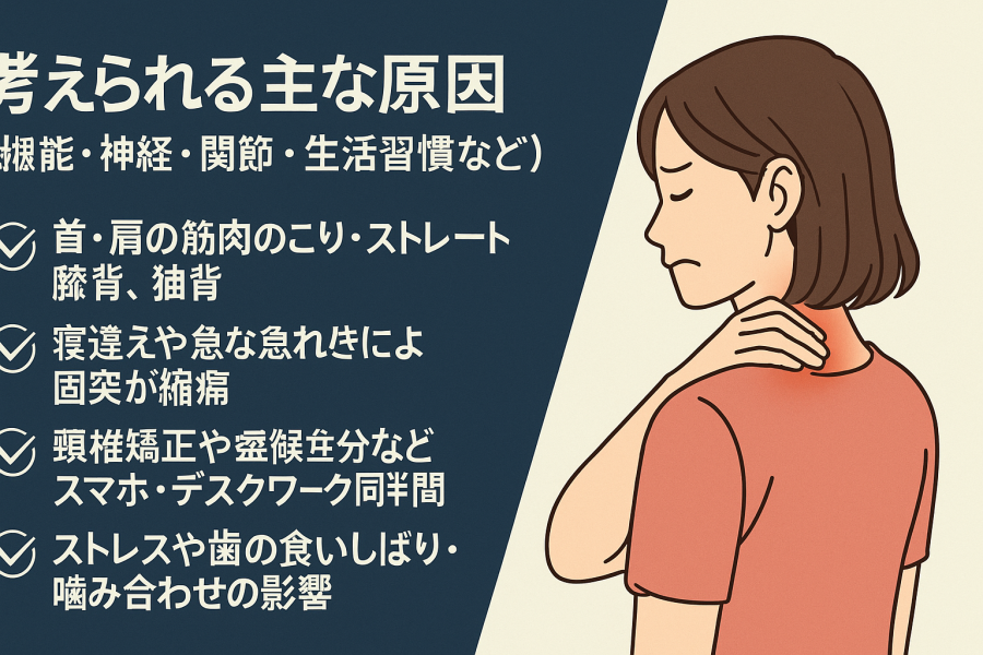 食いしばりや噛み合わせのズレは、顎から首へと筋肉の緊張を伝え、右側の首筋だけ痛む原因になることがあります。