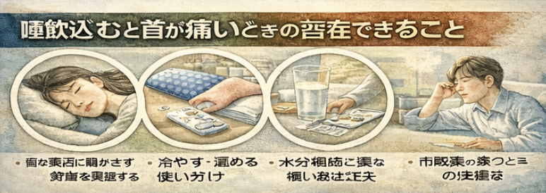 唾飲み込むと首が痛いときは、原因によって合う対処が少し変わります。まず大切なのは、痛みが強い間に首を無理にグルグル回したり、強く押したりしないことです。寝違えや筋肉の炎症が背景にある場合、刺激を入れすぎると余計に痛みが長引くことがあります。首を動かしたときの痛みが中心なら、まずは安静を意識し、痛みの強い初期には冷やすことが合う場合があります。一方、数日たって熱っぽさが引き、張りやこわばりが目立つ段階では、温めることで楽になることもあると言われています。喉の違和感がある場合は、水分補給をしながら乾燥を避け、刺激の強い食べ物や熱すぎる飲み物を控えるのも大切です。また、飲み込みづらさがあるときは無理に硬いものを食べず、やわらかい食事にするのもひとつの工夫です。市販薬を使う場合は、用法用量を守ることが前提ですが、数日使っても変わらない、悪化する、発熱や腫れを伴うといった場合は、自己判断で引っ張らず医療機関に相談したいところです。症状が寝違え寄りなのか、喉や耳鼻科寄りなのかを見ながら、無理の少ない対処を選ぶことが安心につながります。