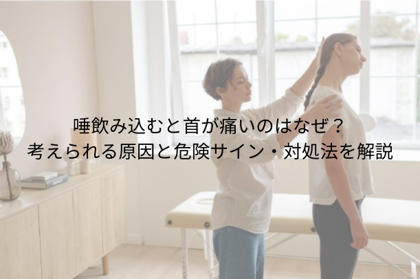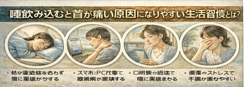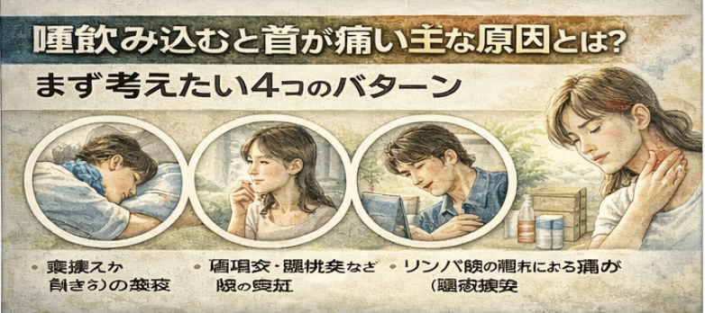 朝起きたあとから首が痛い、振り向きにくい、特定の方向で強く痛む。このような場合は、寝違えや首まわりの筋肉の炎症が関係していることがあります。飲み込む動きに合わせて首前側の筋肉も動くため、唾を飲むと痛みが響くことがあると言われています。