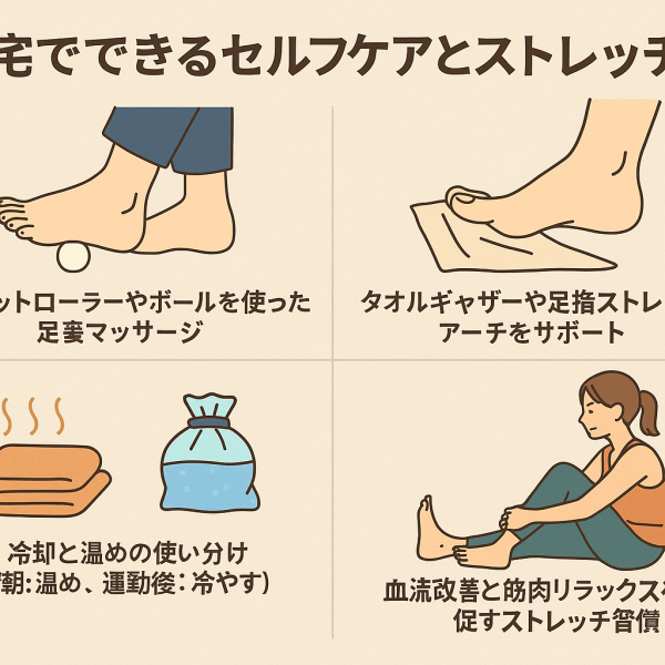 土踏まずが痛い」「歩くと足裏が突っ張る」と感じたとき、まず試したいのが自宅での簡単なセルフケアです。