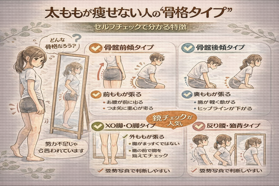 太ももが思うように細くならない時、「筋トレのやり方が悪いのかな…」と不安になる方が多いですが、共通しているのは “骨格タイプによって張りやすい場所が違う” という点です。ここでは、鏡を見ながらその場で確認できるセルフチェックをまじえて、読み手が自分のタイプを理解しやすい流れでまとめていきます。