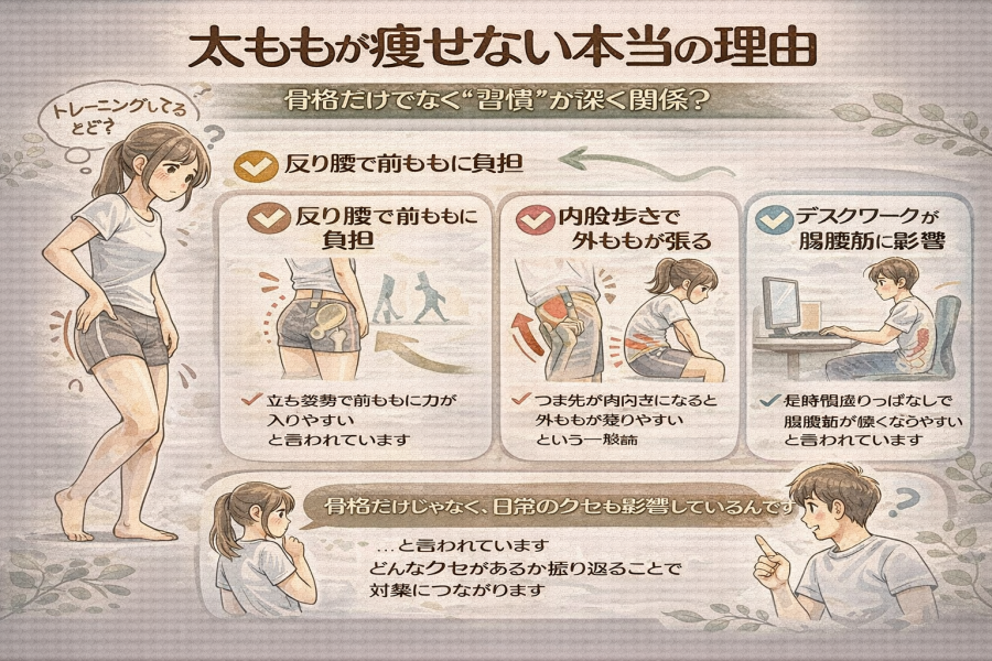 こうした理由から、太ももが痩せない原因は“骨格だけ”では説明しきれず、日常の姿勢・歩き方・筋肉の使い方が重なって起きている可能性があると紹介されることが多いです。「自分はどれかな?」と振り返ってみるだけでも、改善のヒントが見つかることがあります。