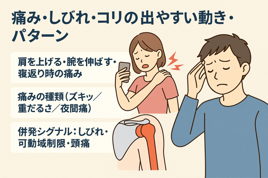 特に注意したいのは、しびれ・可動域の制限・頭痛などが併発している場合です。これは、首の神経が圧迫されていたり、筋肉のこわばりが神経に影響している可能性があるとも考えられています。